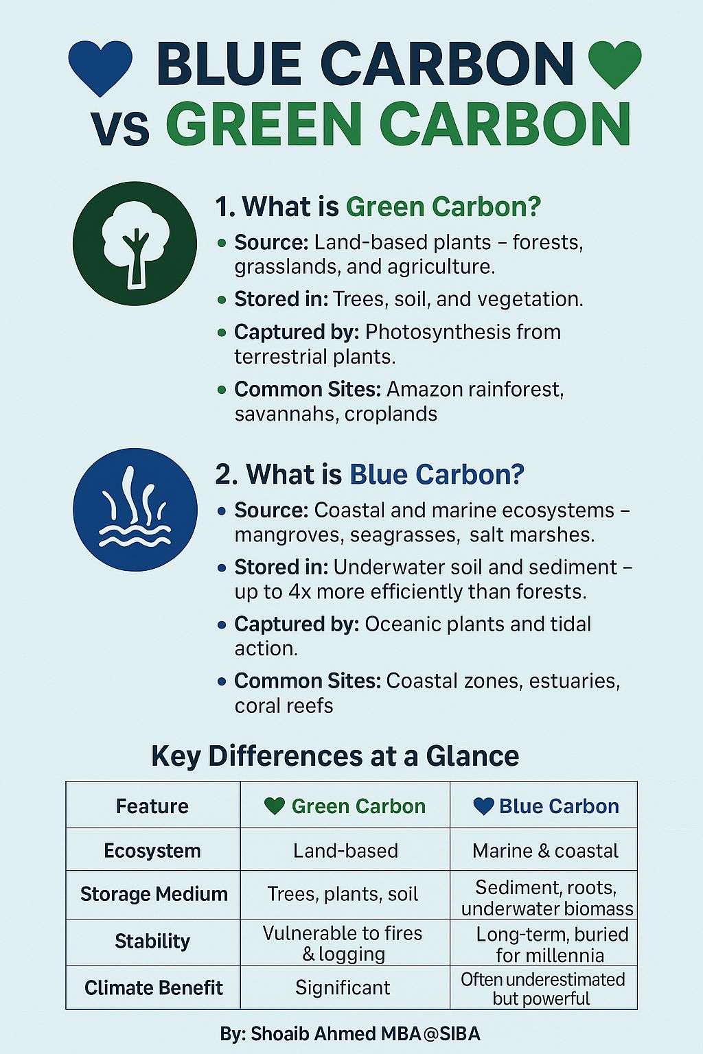 • Ecosystem: Green Carbon is land-based, while Blue Carbon thrives in marine and coastal zones.