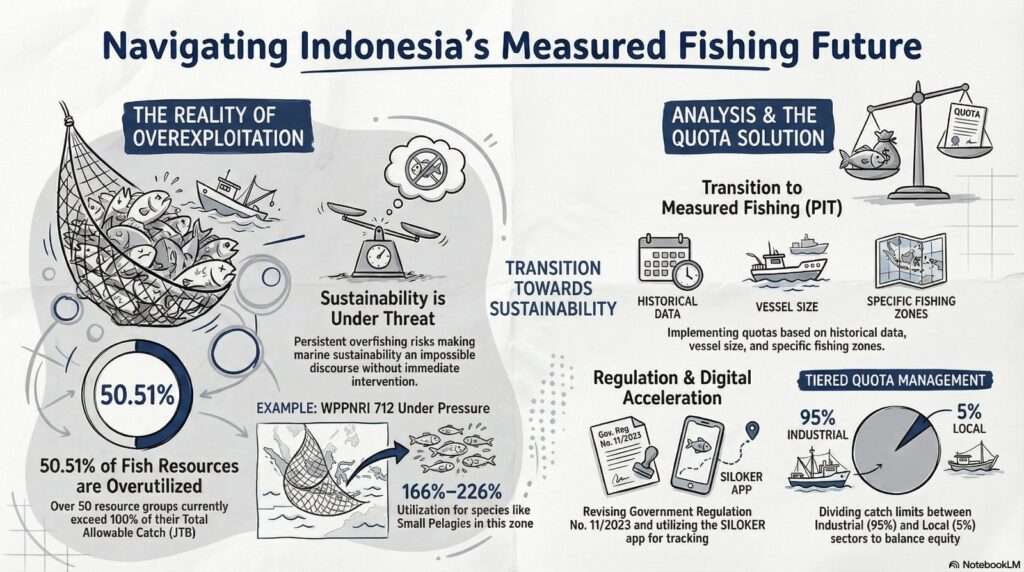 He further highlighted data from WPPNRI 712 (Java Sea), where the situation is even more alarming. Small pelagic fish are exploited at 166% of JTB, while squid has reached 231%.